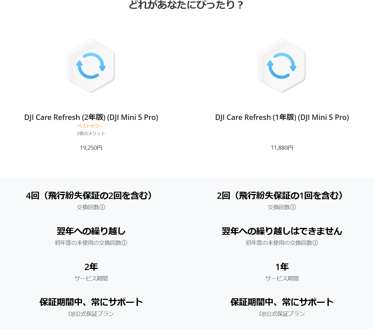 1.初回購入時の条件: 製品は新品で、アクティベーションされていないか、アクティベーションしてから96時間以内であること。2.サービス更新時の条件: お持ちのデバイス用にDJI Care Refreshを以前購入していた場合、現在のサービス有効期限満了後15日以内にDJI Care Refresh(1年版)を購入して、サービス期間を延長できます。
